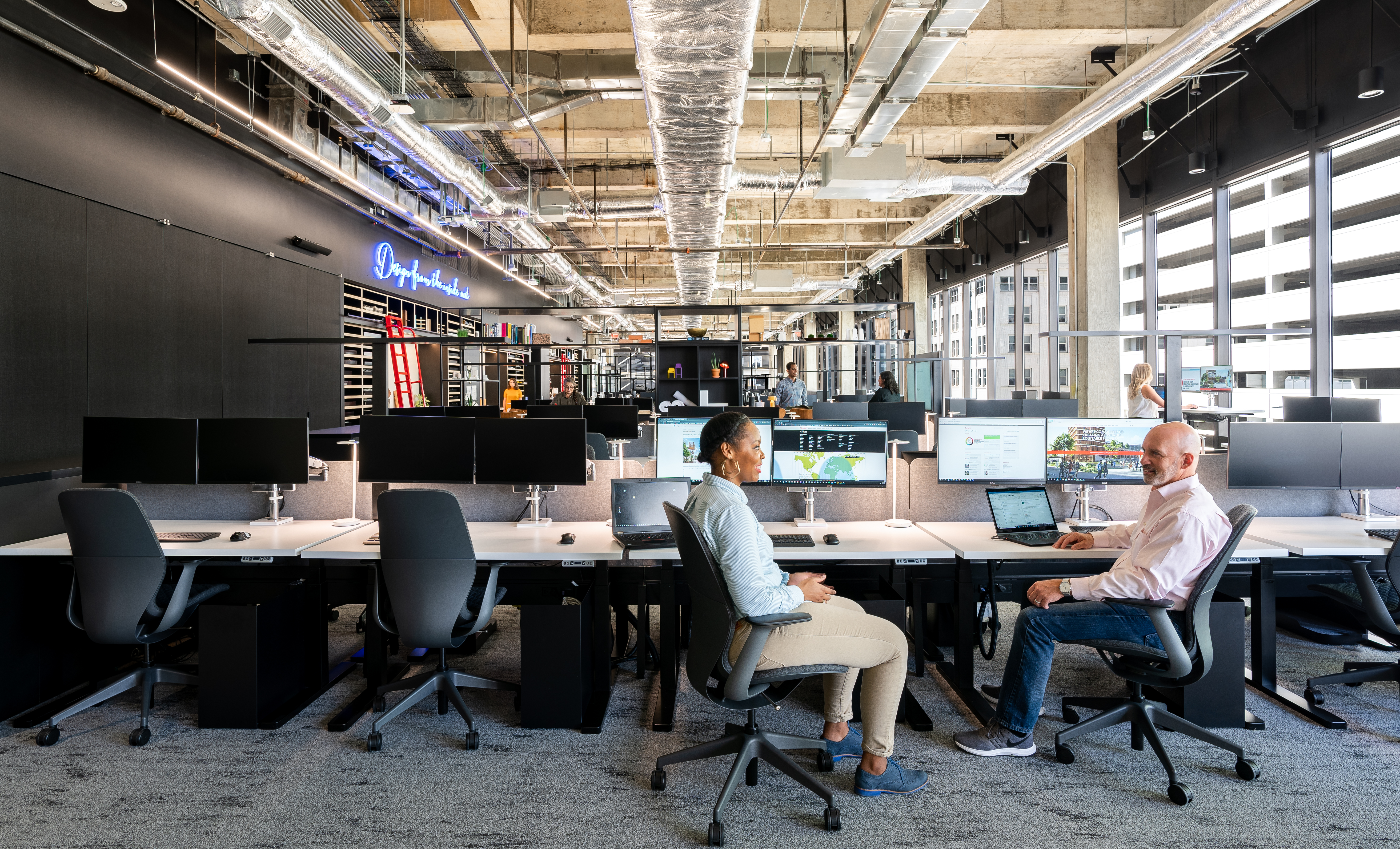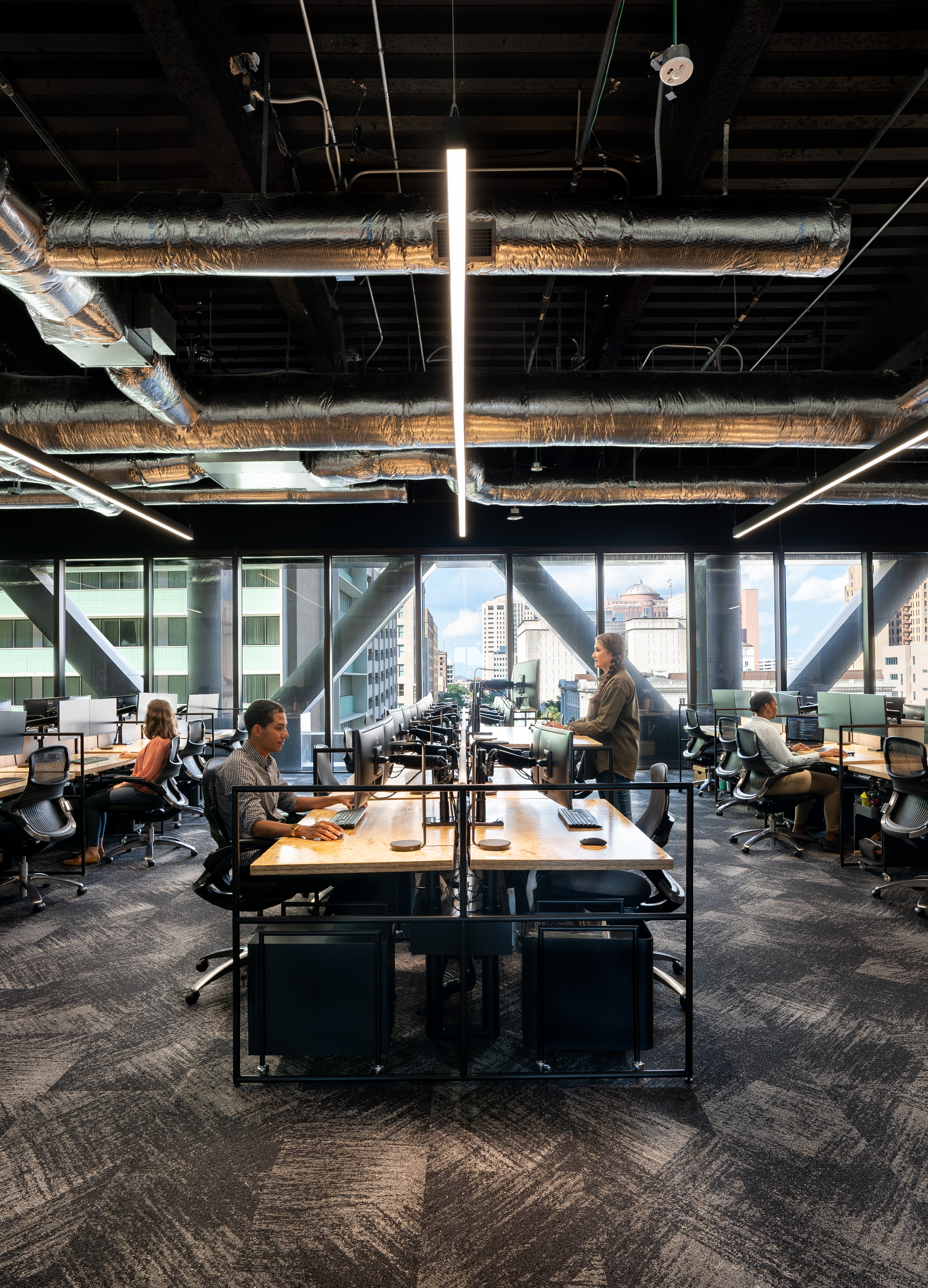 Desk mounted fixtures double as energy-efficient task lighting on the desk as well as uplighitng for the ceiling. Lighting