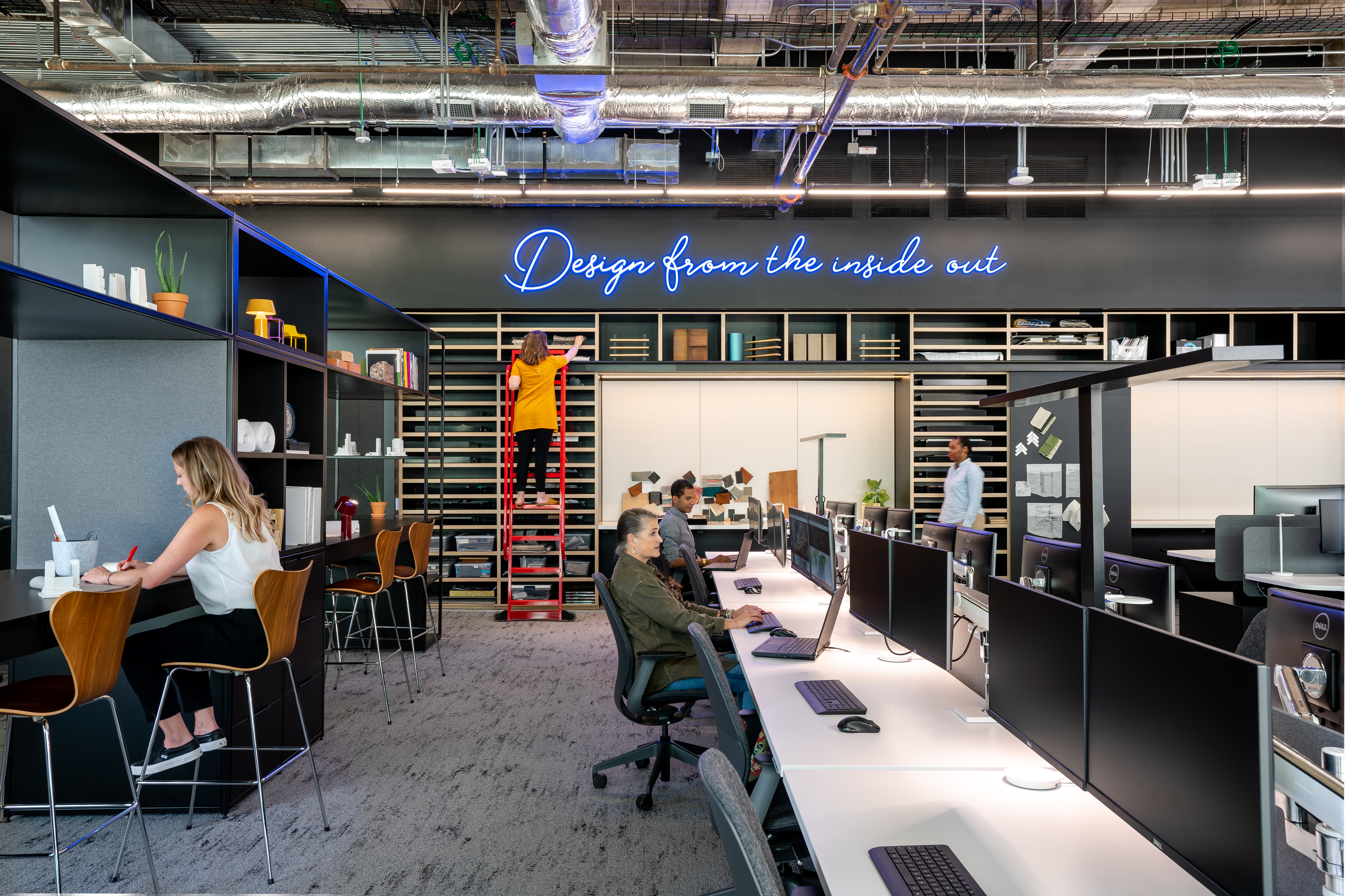 To distinguish studios, the ceiling here was painted charcoal. Accordingly, the lighting flipped the script as well and now provides soft but direct light.