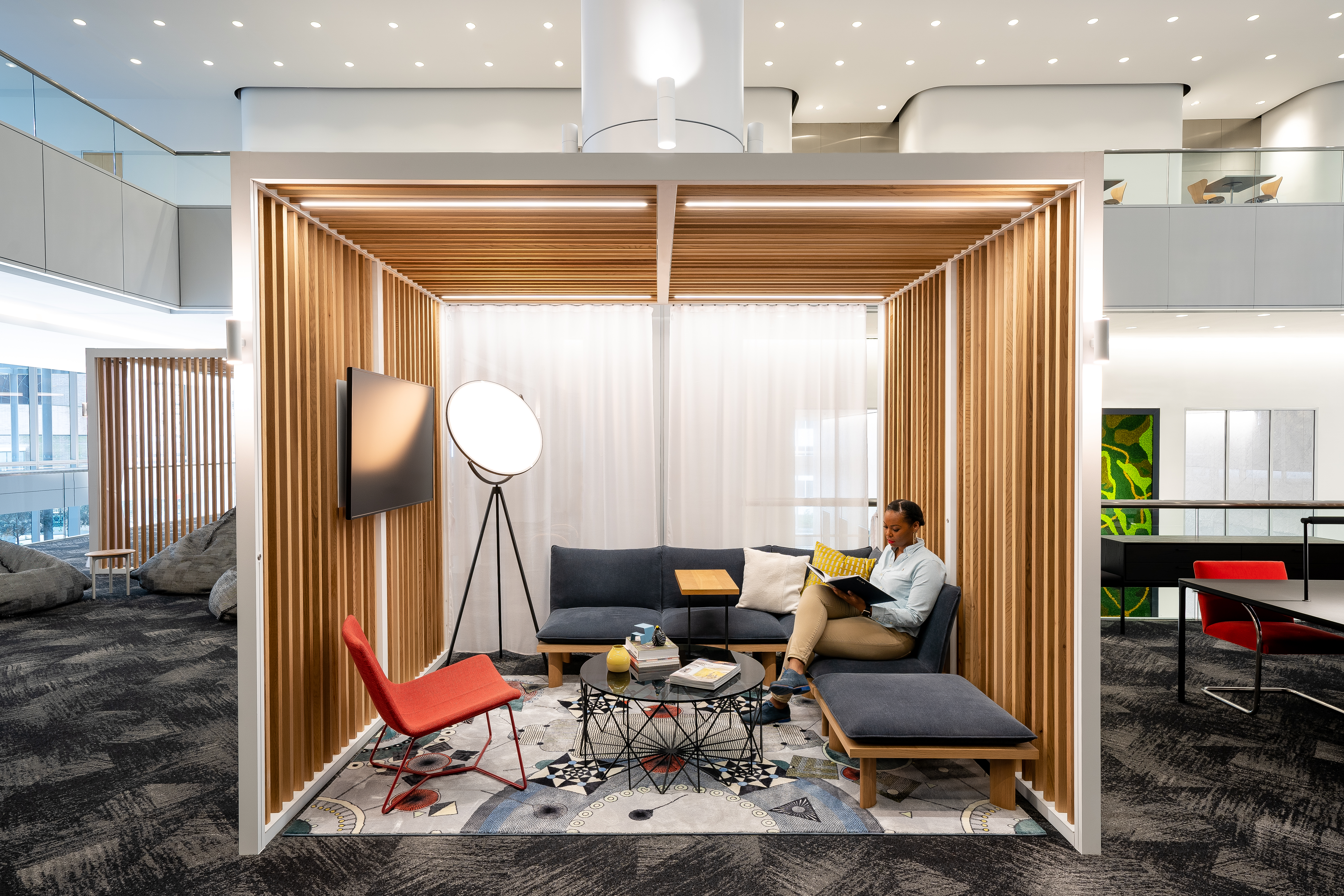 For those who prefer fewer distractions, even smaller huddle spaces with residentially-scaled lighting can be found scattered throughout the office.
