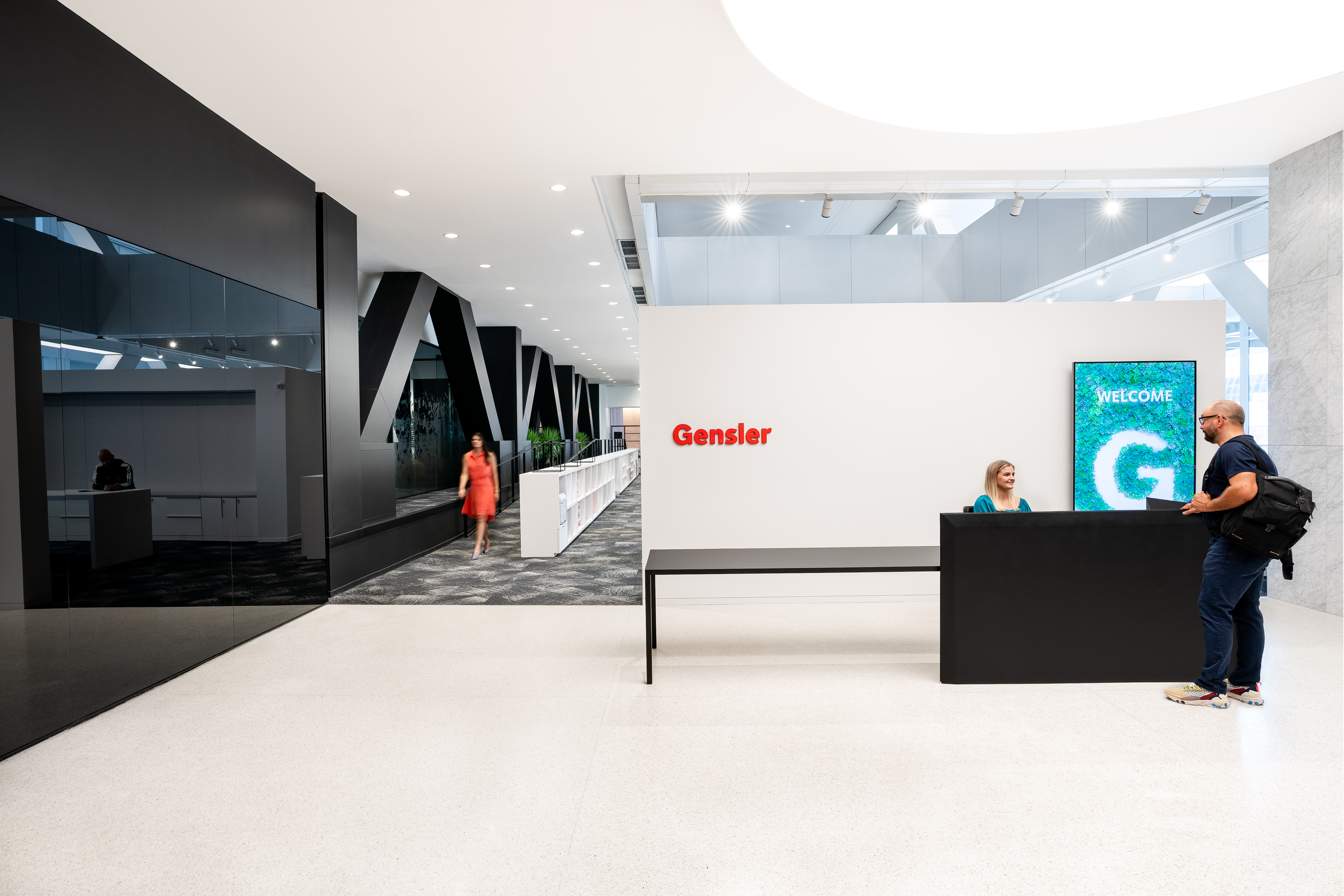 The entry has the least lighting power density of the entire office with the efficient backlighting of the central circular feature. White finishes give excellent reflectance, also make it the brightest space in the office. You know you have arrived.