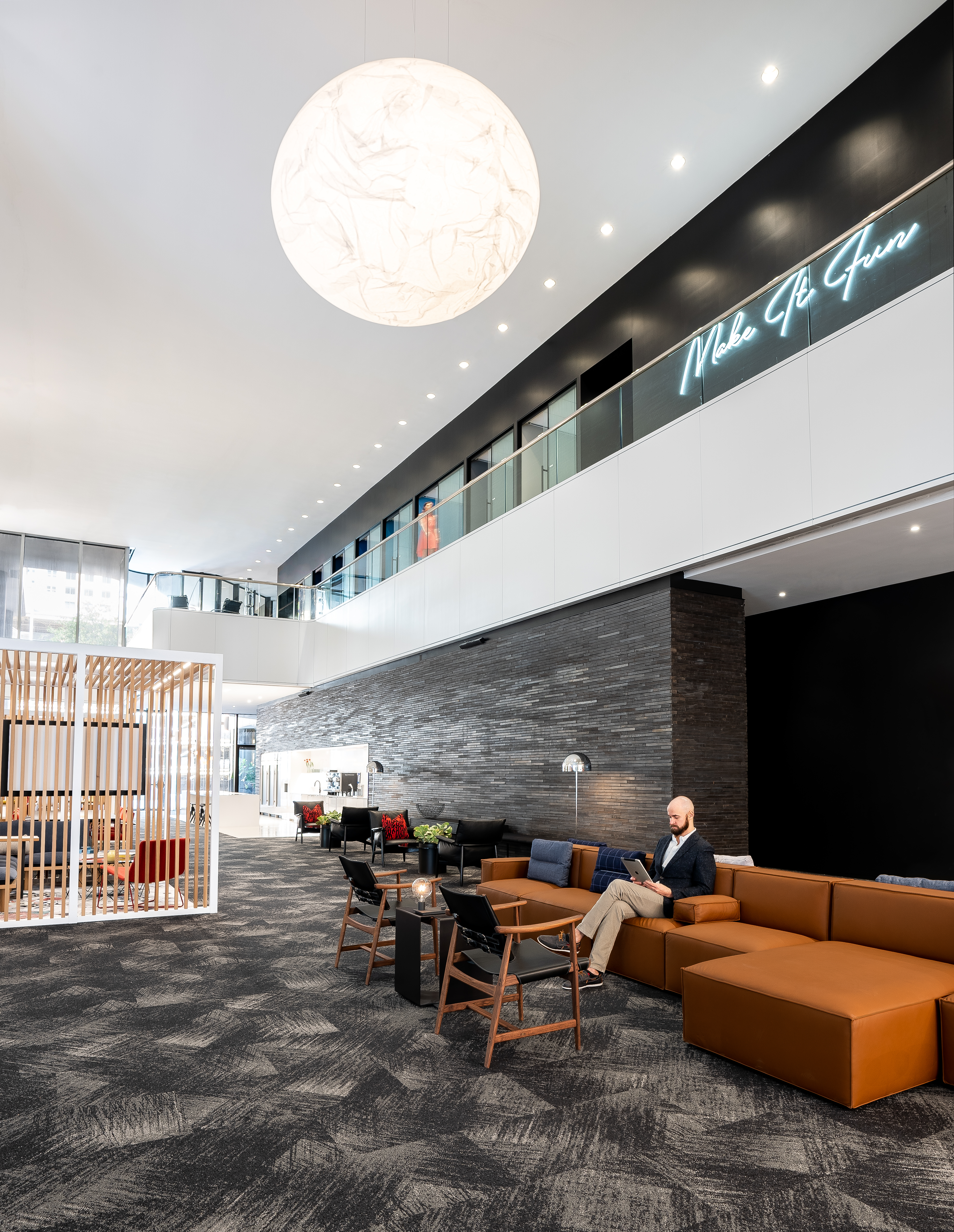 For much of the double height space, retrofitting the downlights with more efficient LED fixtures was the best option. A new pendant gives a splash of visual interest and helps mark a gathering area.