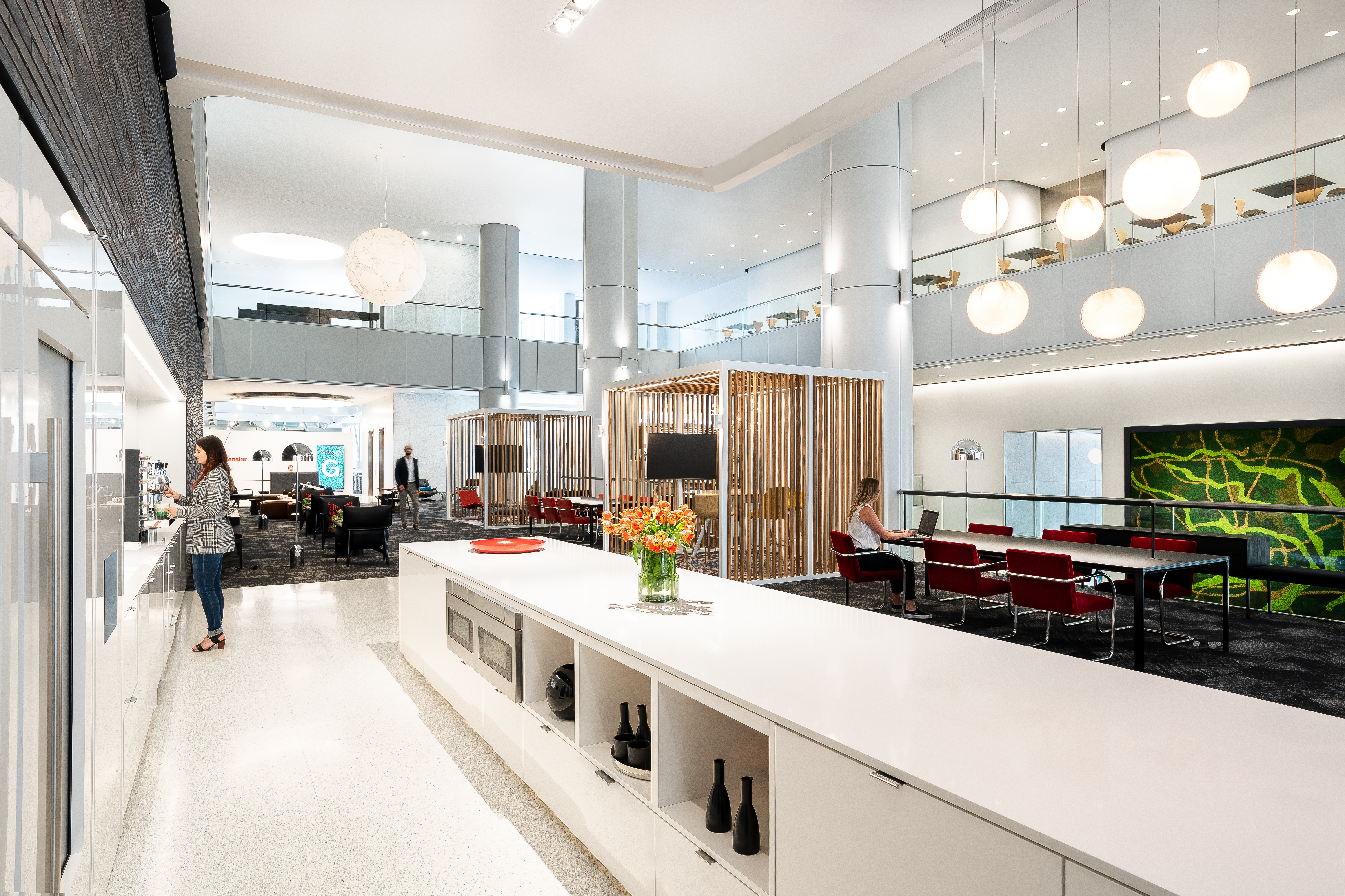 The fun and bold decorative pendants also provide functional task lighting in the huddle spaces. The direct linear lighting helps to reinforce the geometry created with the paneling and lends a soft ambient light to the space.