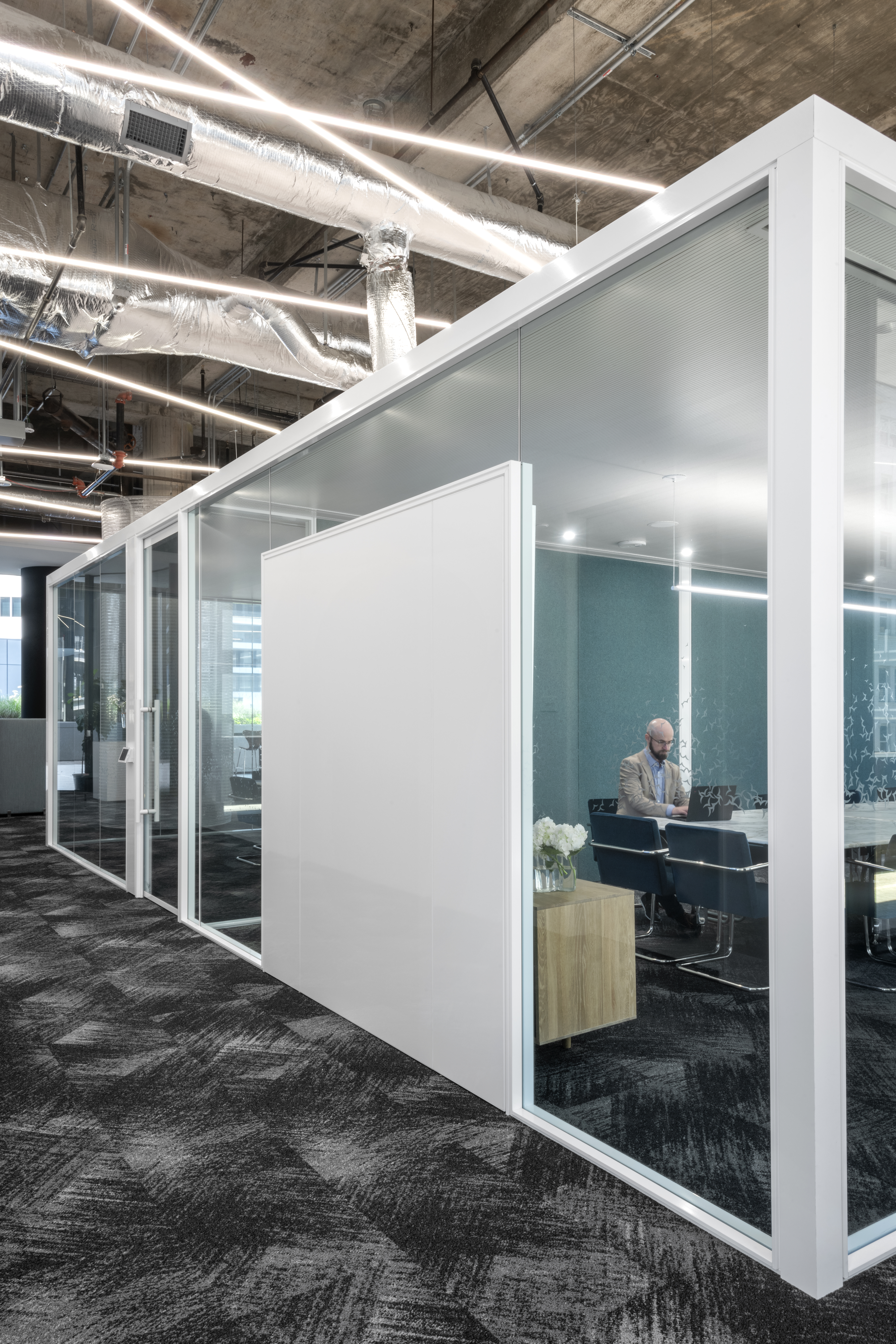 Conference rooms have toned down lighting to keep meetings as distraction free as possible. Simple wall washing and simple decorative pendants inside the rooms give way to more energetic lighting outside to better display the depth and character of space.