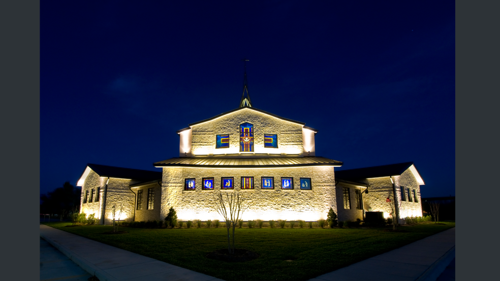 Select interior sanctuary lights were put on an astronomical timeclock so that they would come on in conjunction with the exterior lights. This allows the extensive stained glass windows to glow at night, enhancing the exterior beauty.