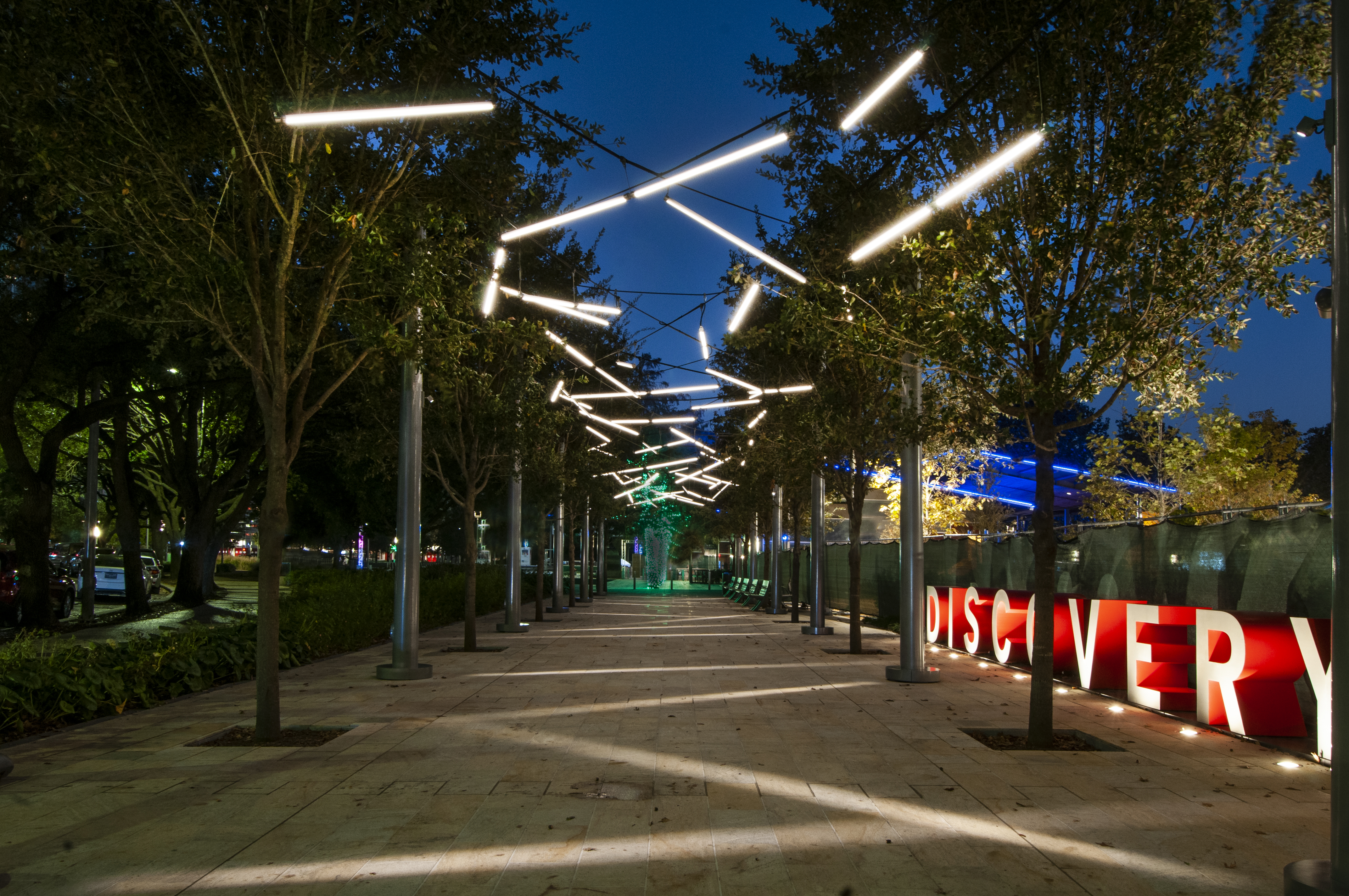 The new vision included a promenade of trees, connected by a playful catenary overhead, along with a revitalized neighboring playground. The Pick-Up Sticks catenary, which was designed to evoke memories of the favorite childhood game, consist of over 70 illuminated sticks suspended at different heights and angles from a highly-engineered catenary system, which visually melts into the flanking tree canopies. The entire custom-designed system spans approximately 125' long by 18' wide. Completing the immersive experience are projectors mounted to each catenary pole, which throw intersecting lines of light along the path.