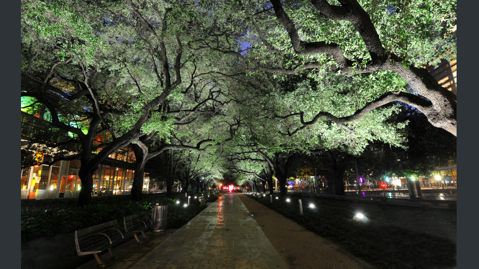 Mature live oak trees are uplit with new LED fixtures along Brown Promenade at Houston’s Discovery Green
