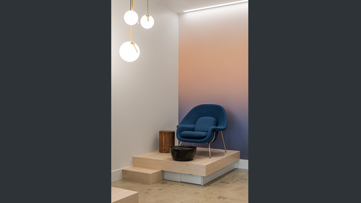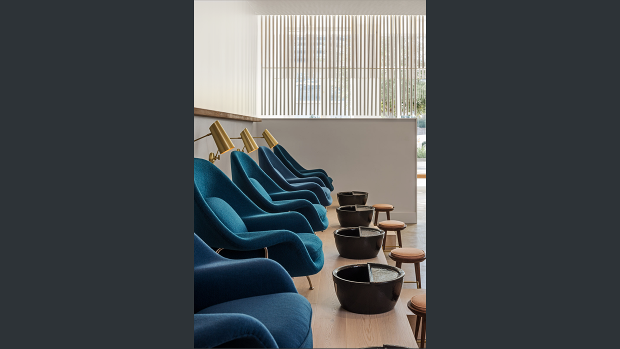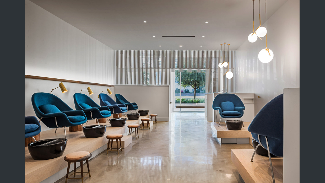 Indirect LED light tucked in the linear shelf behind the pedicure stations lends a subtle design feature to the streamlined space.