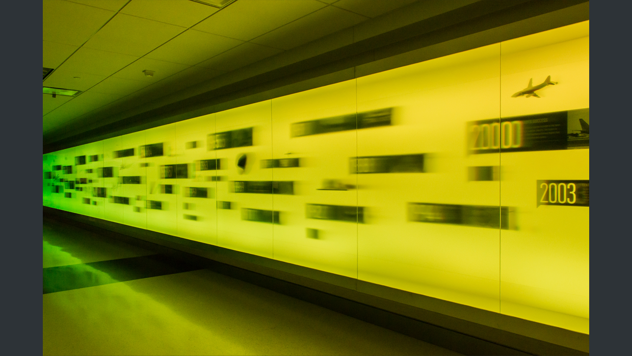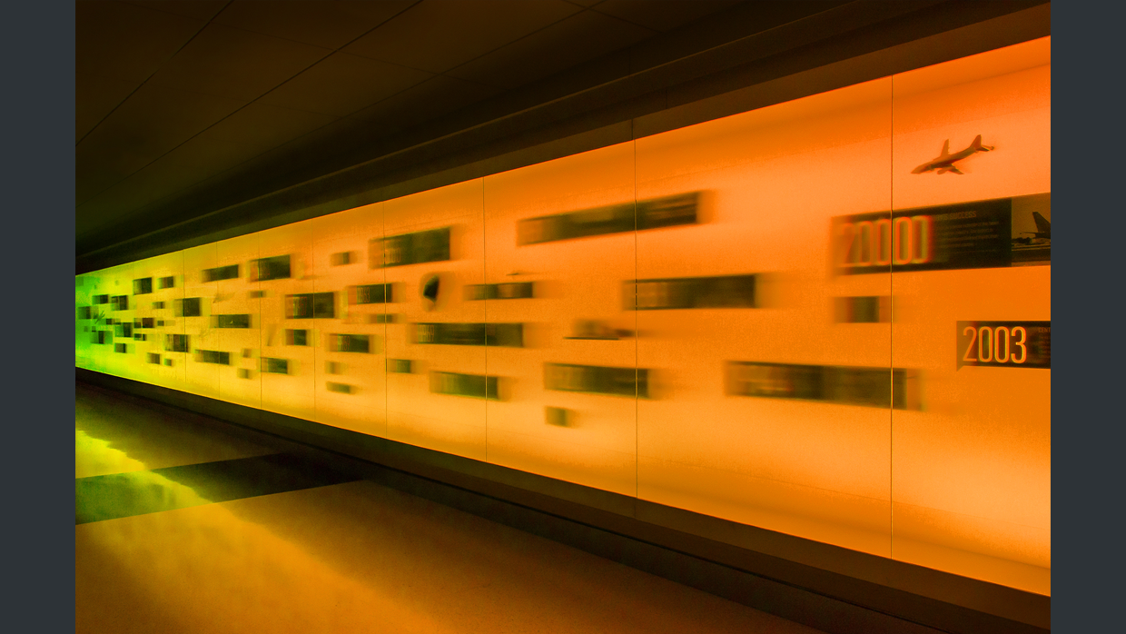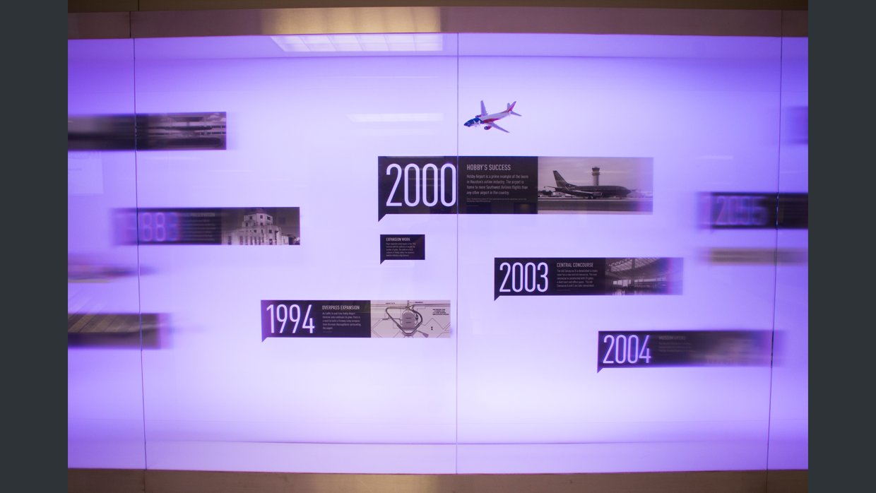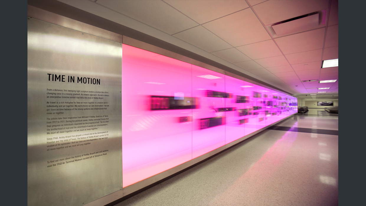 This dynamic art installation exists in Houston's Hobby Airport baggage claim. From a distance, the expansive wall of color-changing light serves as a bold and compelling piece of public art. Up close, an interpretive timeline is revealed, which tells the 75 year history of the airport. The effect of a 'timeline in motion' is enhanced not only with the movement of the colored lights, which gracefully roll from one end to the other, but also from a specialized glass in front that is transparent when viewed from straight on, but increasingly blurred from longer angles. The distortion creates the effect of blur and motion.