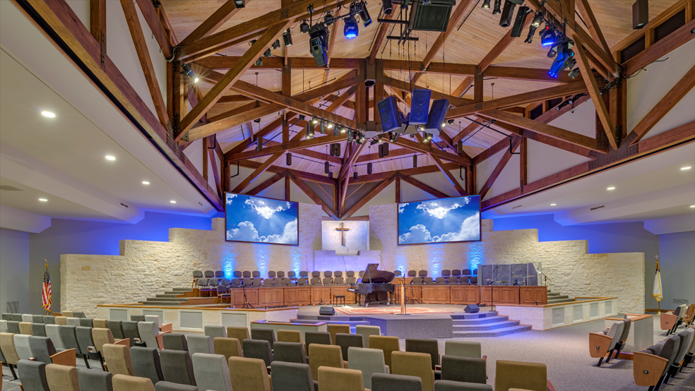 The Woodlands First Baptist Church sanctuary with new LED downlights and color-changing backlights to adjust to the mood or theme of the service.
