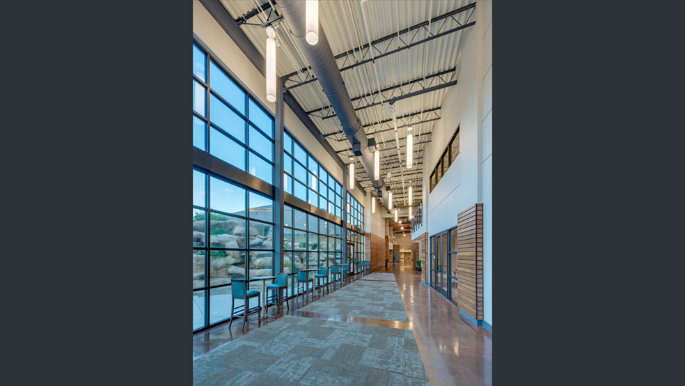 Cylindrical LED pendants in the entry lobby were a dramatic, yet efficient, way to draw visitors in to the new Great Hall. Placed in staggered rows, they convey a sense of movement as one navigates the expansive circulation space.
