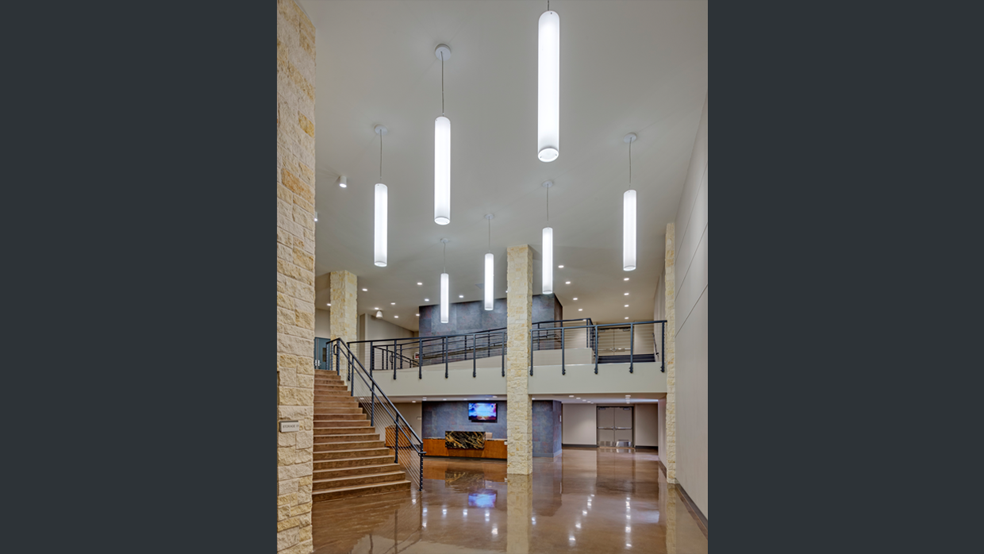 Staggered rows of LED pendants lead visitors through the lobby at The Woodlands First Baptist Church